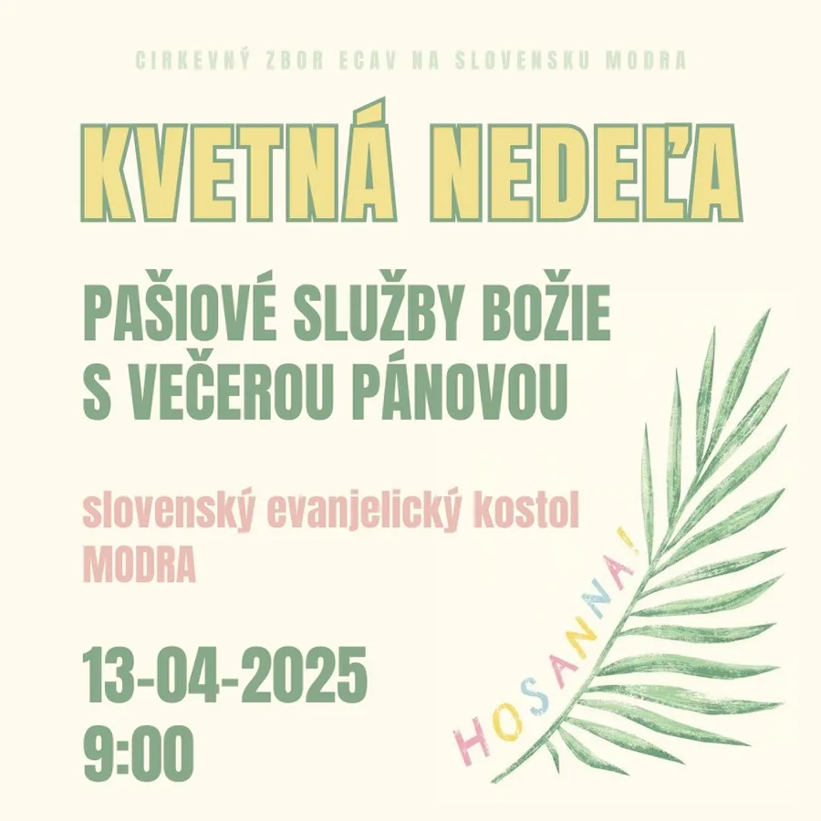 Pozývame na pašiové služby Božie s Večerou Pánovou na Kvetnú nedeľu 13. apríla 2025 o 9:00 v slovenskom evanjelickom kostole v Modre