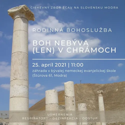 V nedeľu 25. apríla 2021 bude rodinná bohoslužba o 11:00 hod v záhrade v bývalej nemeckej evanjelickej škole (Štúrova 61) /v prípade priaznivého počasia/