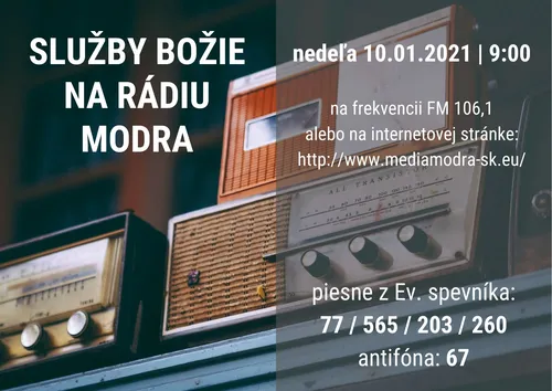 V nedeľu 10.01.2021 bude o 9:00 hod prenos služieb Božích zo slovenského ev. kostola ap. Petra a Pavla v Modre (na frekvencii FM 106,1 alebo na internetovej stránke http://www.mediamodra-sk.eu)